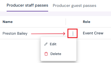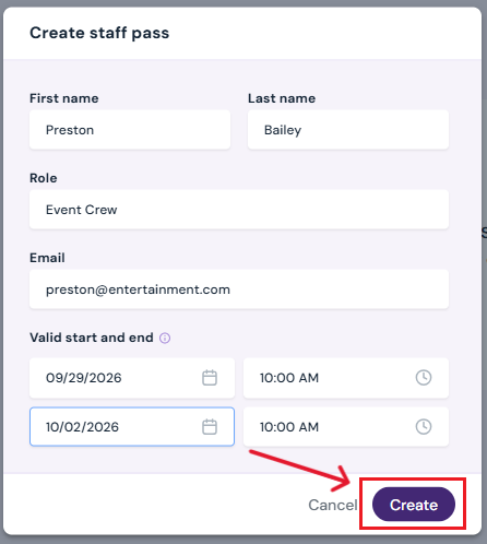 Staff passes allow you to manage event personnel access efficiently by issuing time-bound, role-specific passes. This feature is available for self-produced events only.
