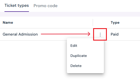 To speed up setup, you can duplicate an existing ticket type and modify only the necessary fields (e.g., name, quantity, or pricing).