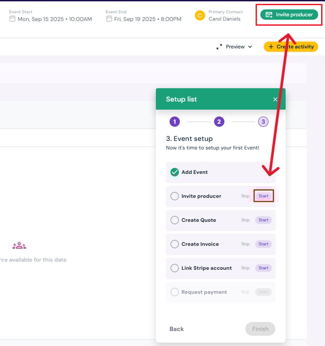 • Click the Start button next to Invite  Producer on the setup list pop-up (bottom right corner).