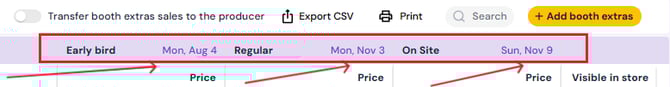 At the top of the table (purple bar), enter sale dates for Early Bird, Regular, and Onsite pricing. Note: Dates must be set in the future or the item will not appear in the storefront.