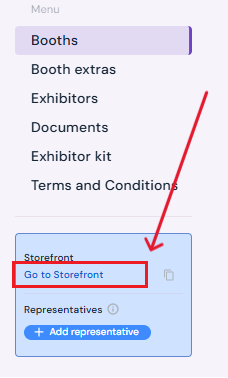 - Click on Go to Storefront in the blue box under the menu on the left hand side to check booth extras listings in the storefront.