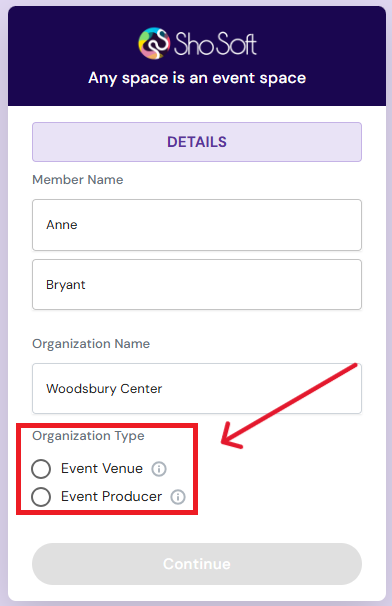 - Pick organization type: event Venue or event Producer ⚠️ Important: This choice cannot be changed later. Be sure to select the option that best matches your role in the event business as this determines the features and setup flow you’ll see in Sho-Soft.
