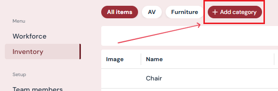 On the Inventory page, click the Add Category button at the right end of the category list.