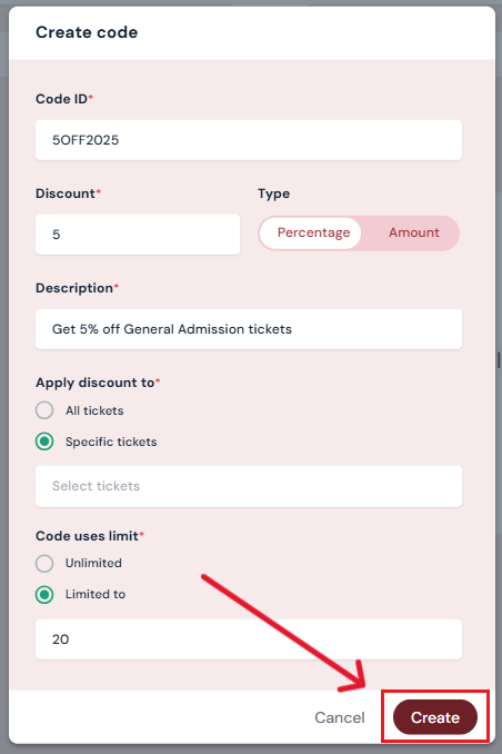 Code: Type the promo code attendees will use at checkout (e.g., VIP25, FALL10).