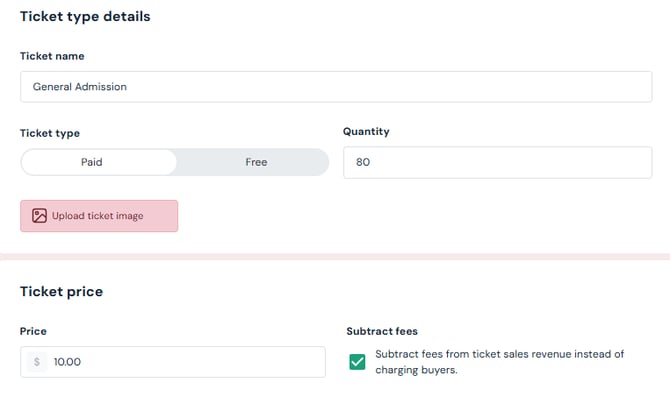 • Subtract Fees: Check this box to deduct Stripe processing fees from your ticket revenue instead of charging buyers.