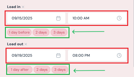 Optional: Use shortcut buttons (1/2/3 days before or 1/2/3 days after) to quickly apply common load-in/load-out windows.
