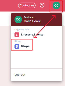 Note: You can access your stripe account at any time through your profile settings. Click on your initials at the top right hand side of the page and select Stripe.