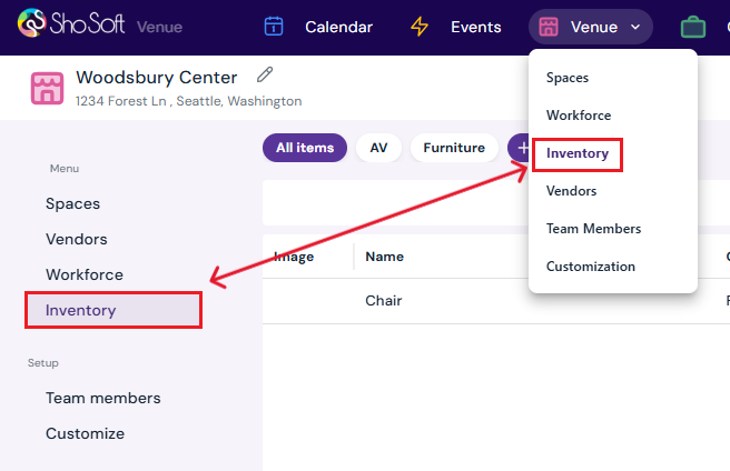In Sho-Soft, Inventory represents the items and resources available at your venue. You can add, edit, or remove inventory to keep your records accurate and ensure event planners know what’s available.