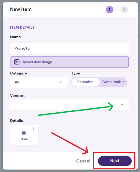 • Optional:  select a vendor (if needed, you can add/edit vendors)
