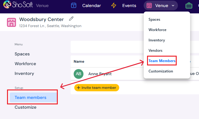 In Sho-Soft, Team Members are users you invite to collaborate on your venue account. Each team member has a role (e.g., Venue Owner, Event Manager, Accountant) that controls their permissions. You can add new members, update roles, or remove members at any time.