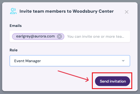 Pick the role for the team member/s from the dropdown (Venue Owner, Event Manager, Accountant). You can only assign one role per invite group. To invite team members with different roles, please send separate invites.